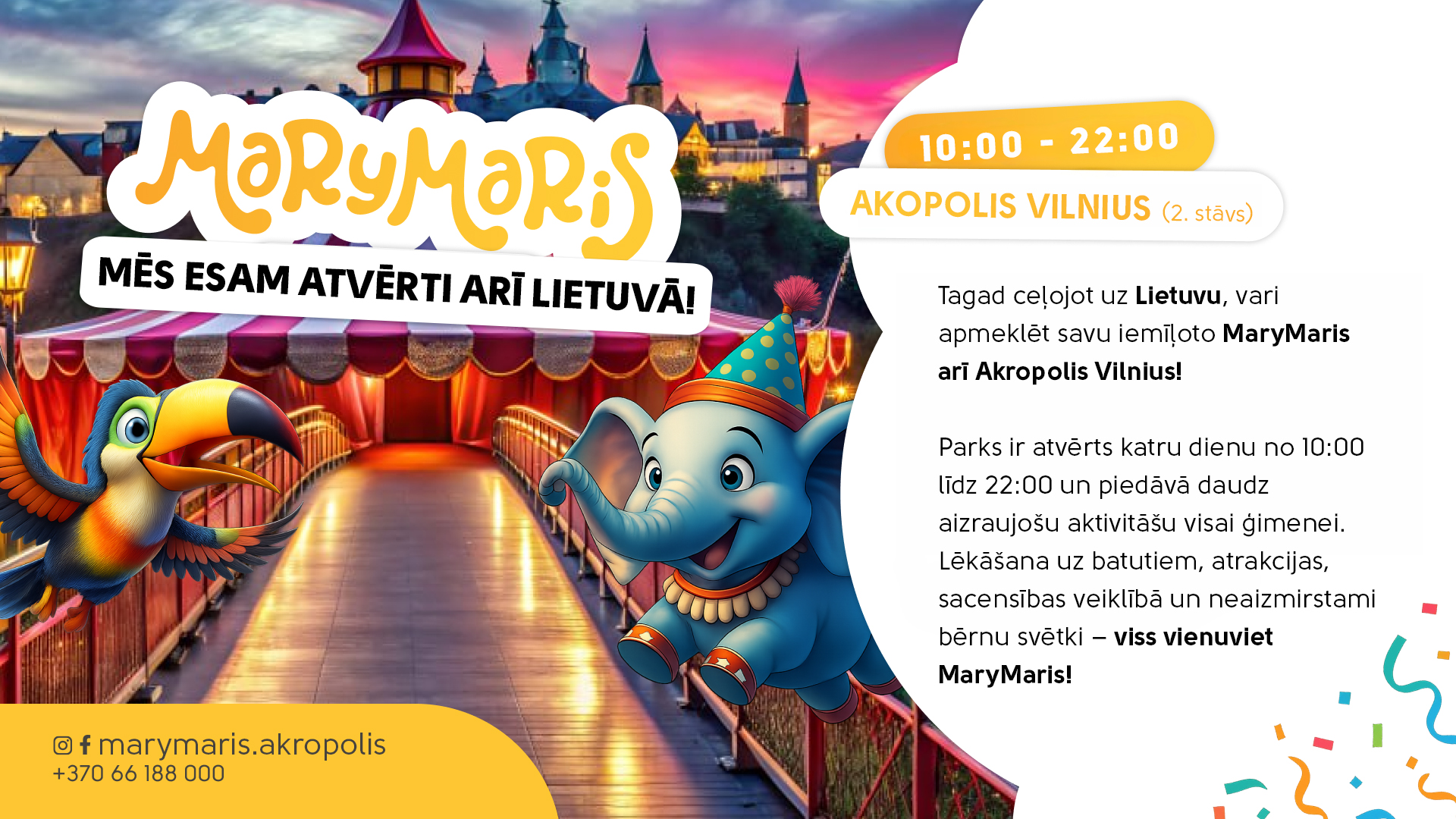 MaryMaris ir unikāla vieta, kur visa ģimene var jautri un bezrūpīgi atpūsties. Spēlēt, lekt uz batutiem, sacensties veiklībā, braukt ar atrakcijām, baudīt laiku un svinēt bērnu svētkus.