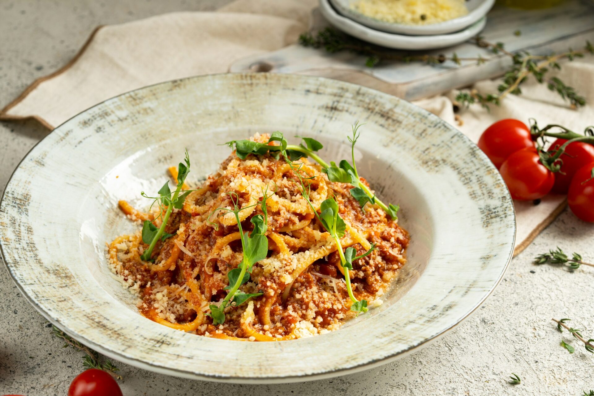 Pasta, tomāti, liellopu gaļa, burkāni, sīpoli, selerijas sakne, tomātu mērce, parmezāns, oregano, garšaugi, ķiploki, sāls, pipari.