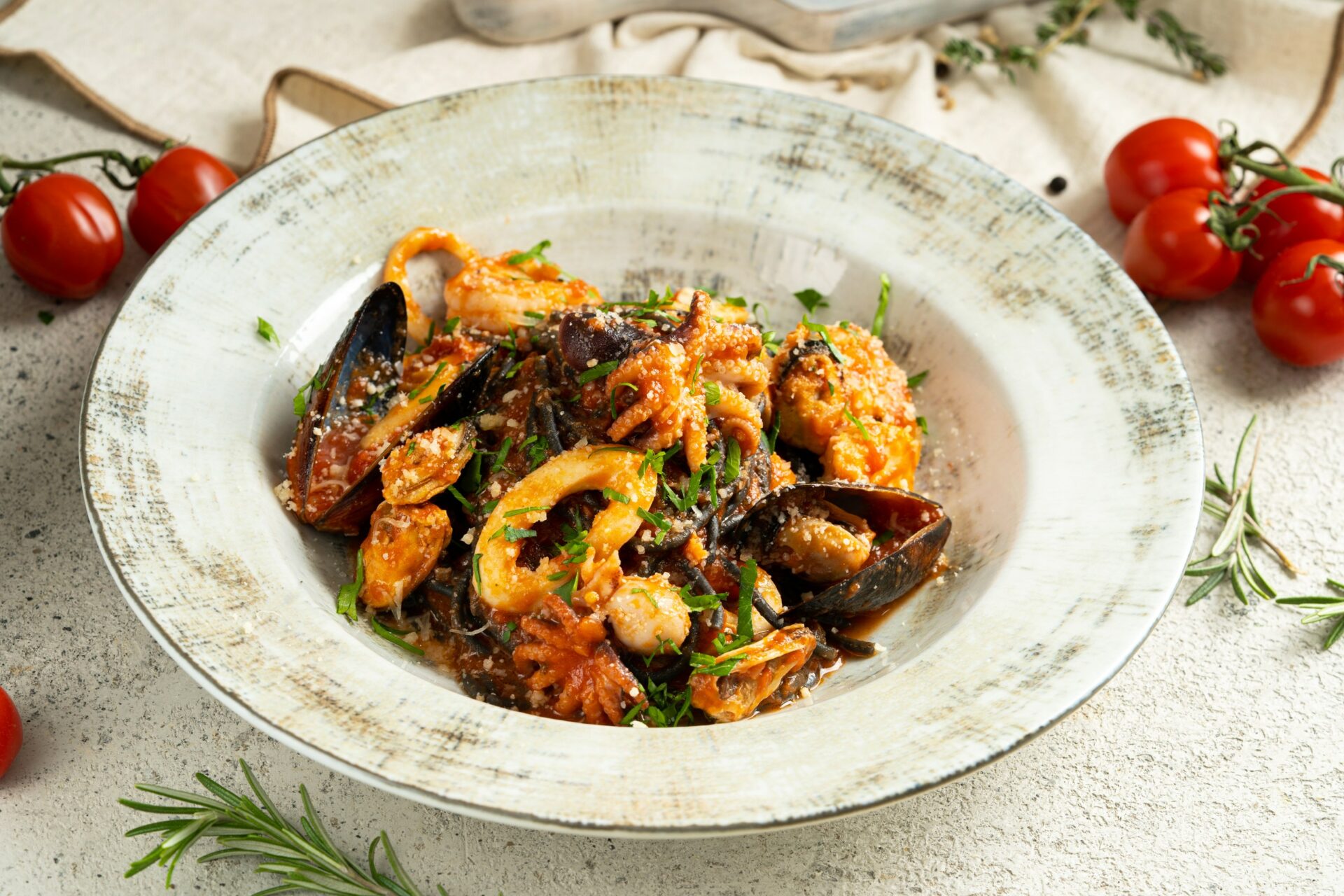 Pasta, jūras veltes, lasis, tomātu mērce, sīpoli, ķiploki, parmezāns, zivju buljons, timiāns, garšaugi, sāls, pipari.