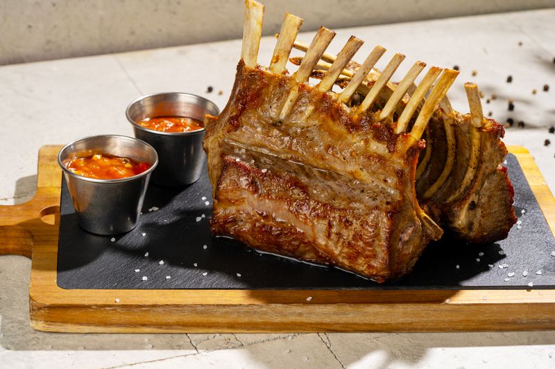 Jēra karbonāde ar kaulu, cepta paprikas mērce ar mango, cepta paprikas mērce
