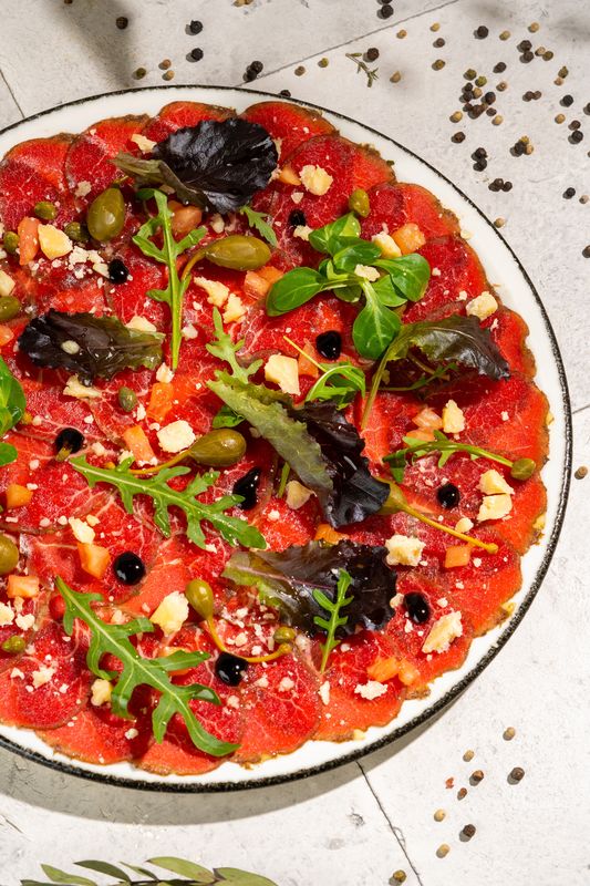 Liellopu fileja, tomāti, salātu maisījums, parmezāna siers, kaperi