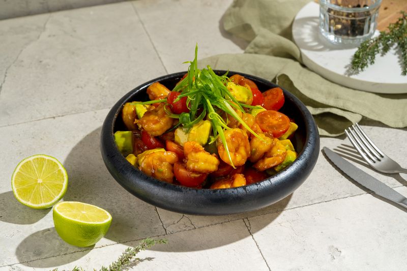 Tīģergarneles, avokado, ķiršu tomāti, loki, ingvera mērce
