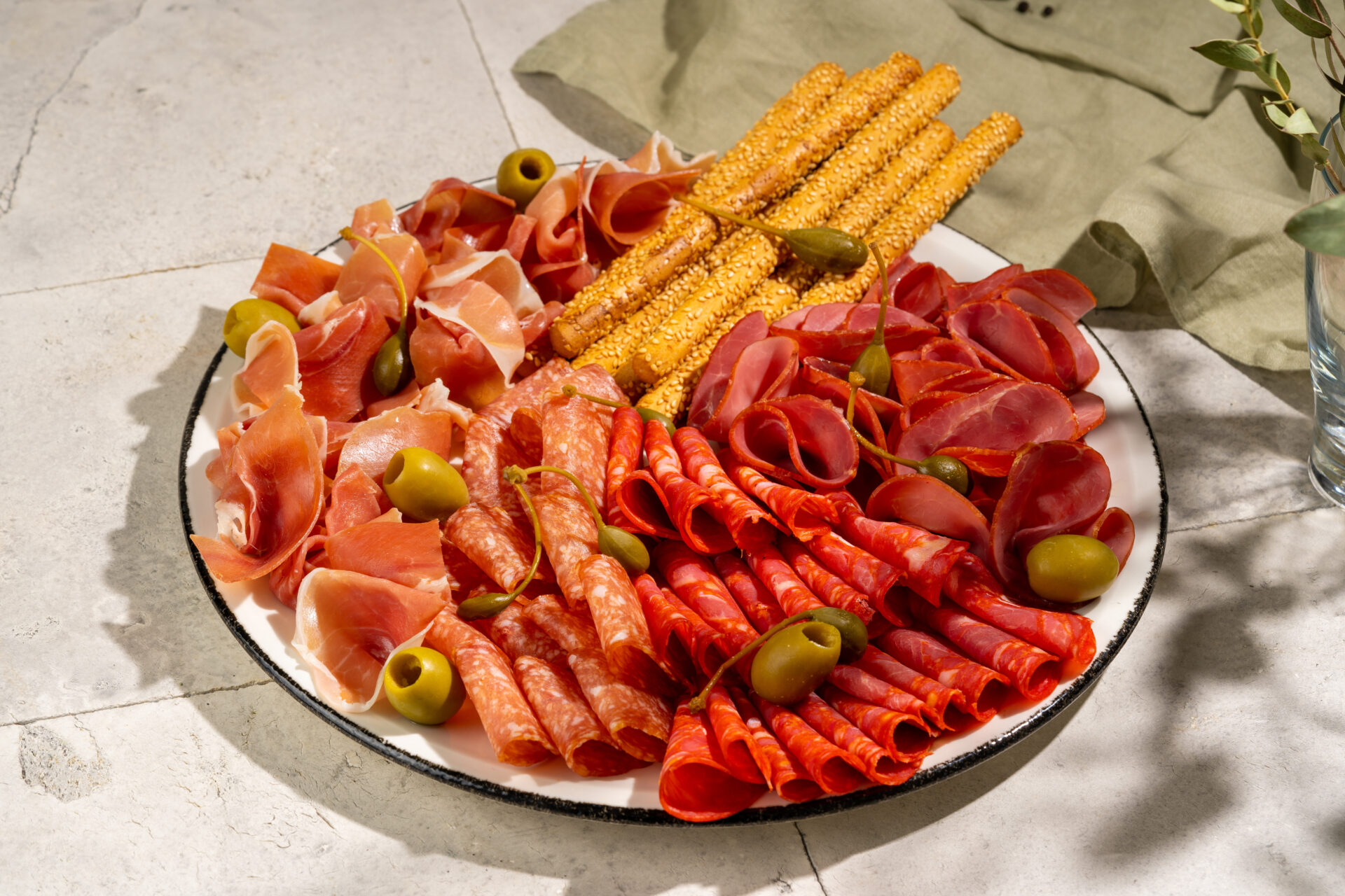 Čorizo, kūpināta liellopa gaļa, salami, parmas šķiņķis, grissini, kaperi