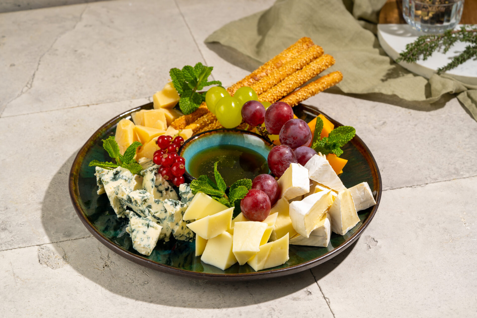 Čedara siers, mocarella siers, parmezāna siers, dorblu siers, kamambēra siers, grissini, medus, vīnogas, ogas
