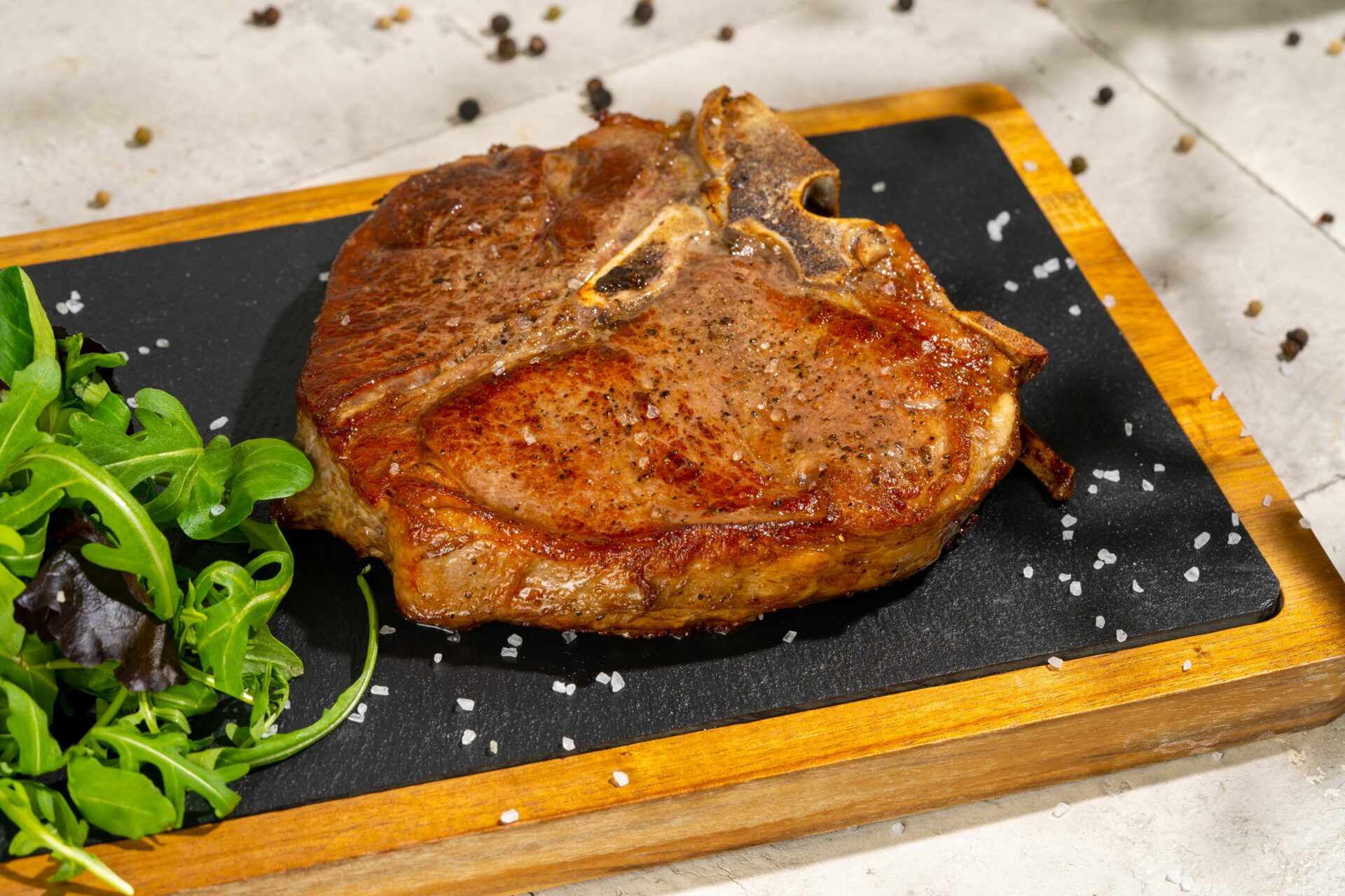 Steiks ar kaulu, salātu maisījums, cepta paprikas mērce ar mango, cepta paprikas mērce