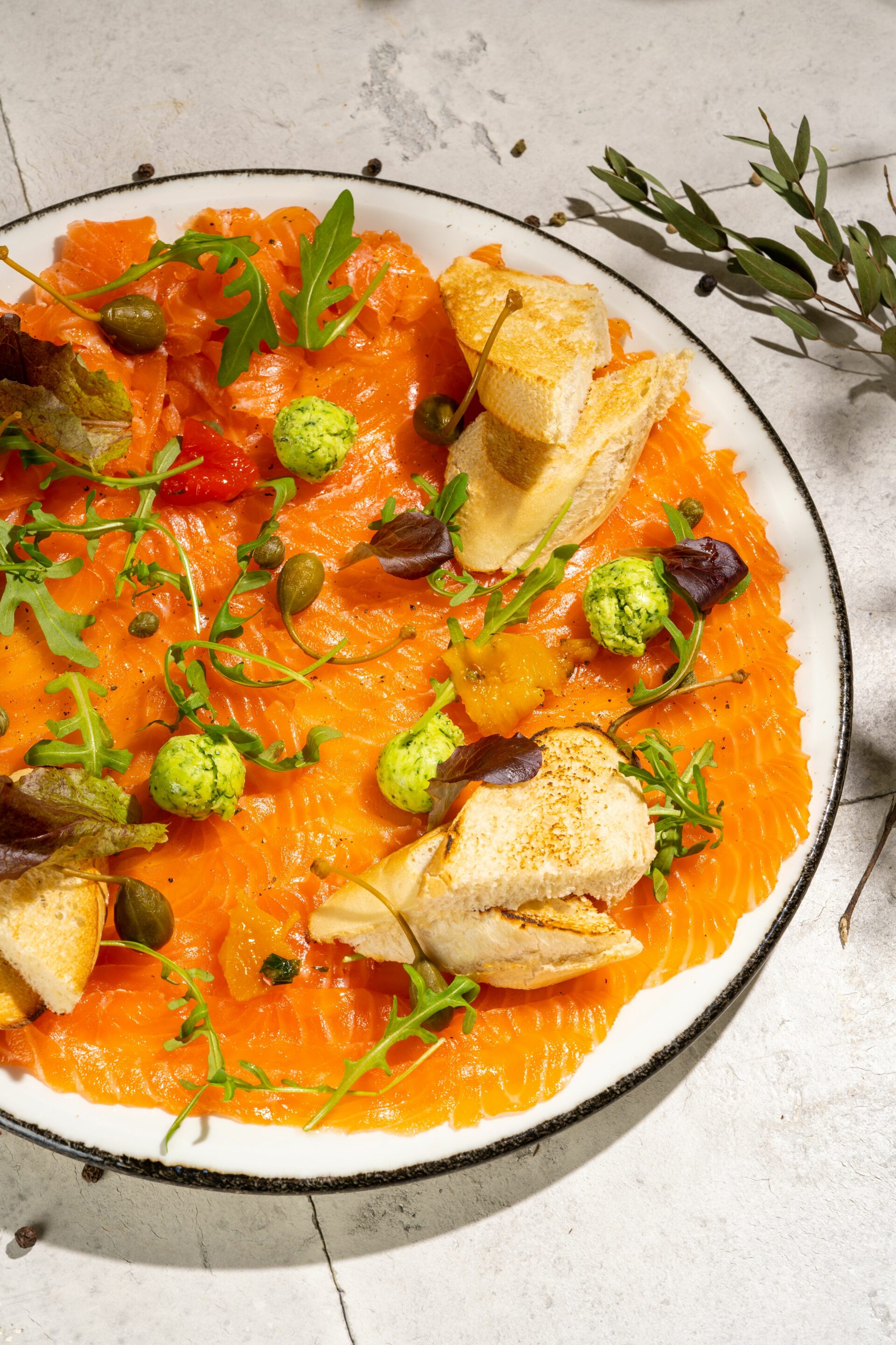 Mazsālīts lasis, kaperi, salātu maisījums, zaļš sviests ar ķiplokiem, bagete, cepta paprika