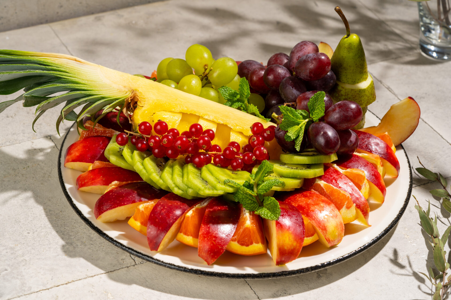 āboli, bumbieri, apelsīni, vīnogas, ananāss, kivi, ogas