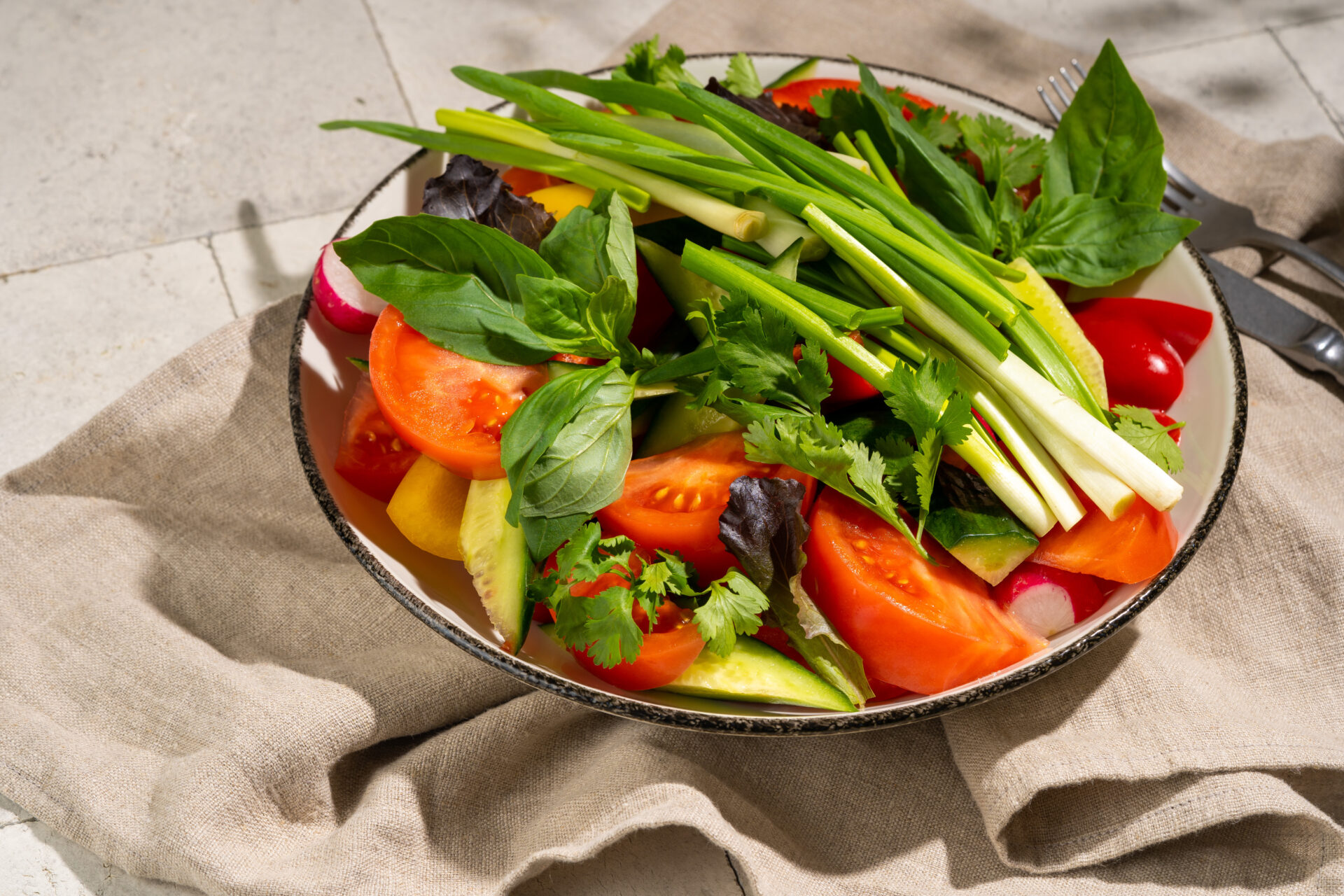 Svaigi gurķi, svaigi tomāti, paprika, redīsi, garšaugi. Mērce pēc izvēles: skābais krējums, sviests.