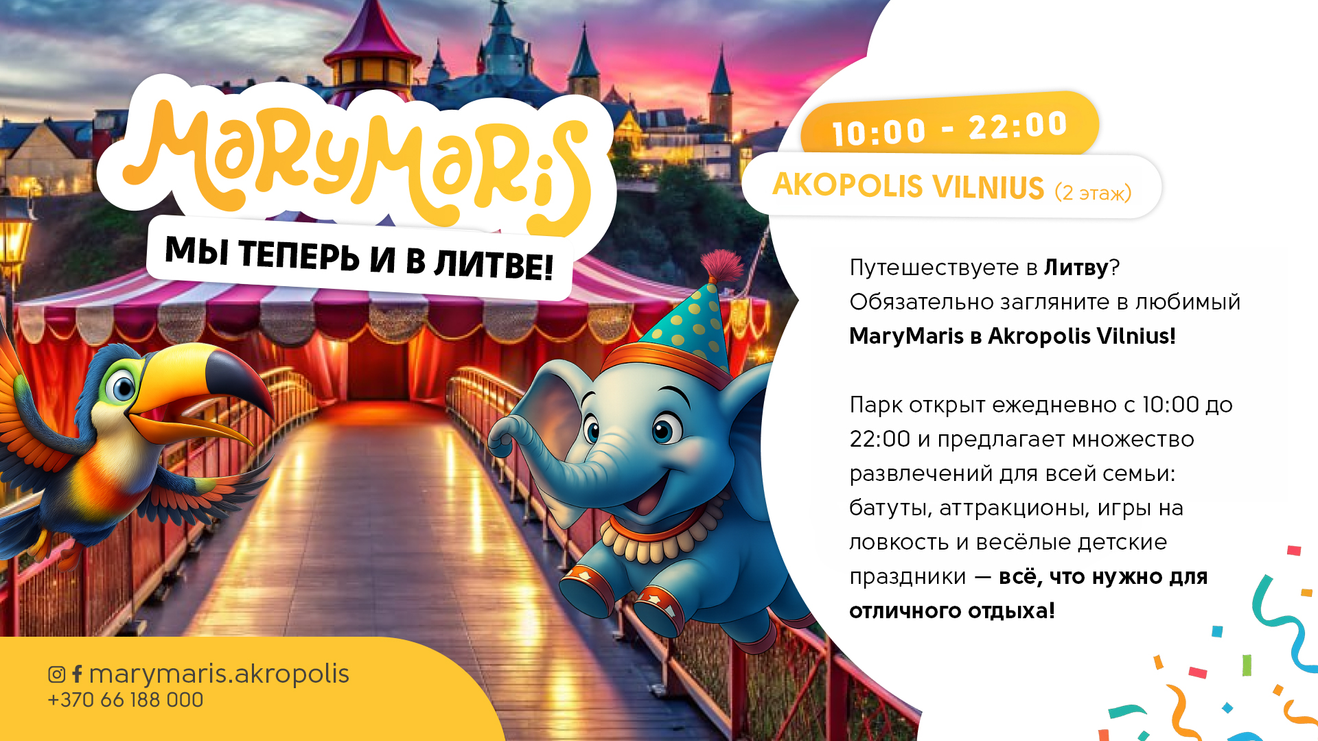 MaryMaris это уникальное место, где можно весело и беззаботно отдохнуть всей семьей. Поиграть, попрыгать на батуте, посоревноваться в ловкости, покататься на аттракционах, с удовольствием провести время и отметить детский праздник.